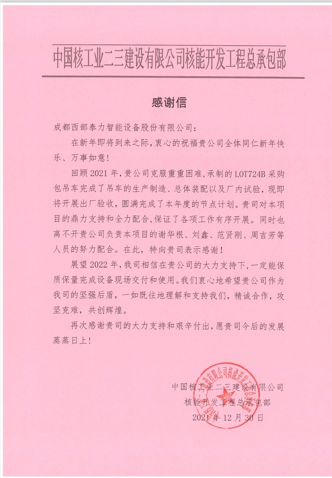 概要:近期,西部泰力收到了一封来自中国核工业二三建设有限公司核能开发工程总承包部热情洋溢的感谢信,主要对我司的项目实施团队、项目经理、技术负责人、质保经理以及项目接口人的全力支持和协助表示感谢,对他们勤奋敬业、踏实务实的工作精神,认真勤勉、专业务实的服务态度表示真心的感谢,并表示愿与西部泰力在今后的工作中可以精诚合作,攻坚克难,共创辉煌。