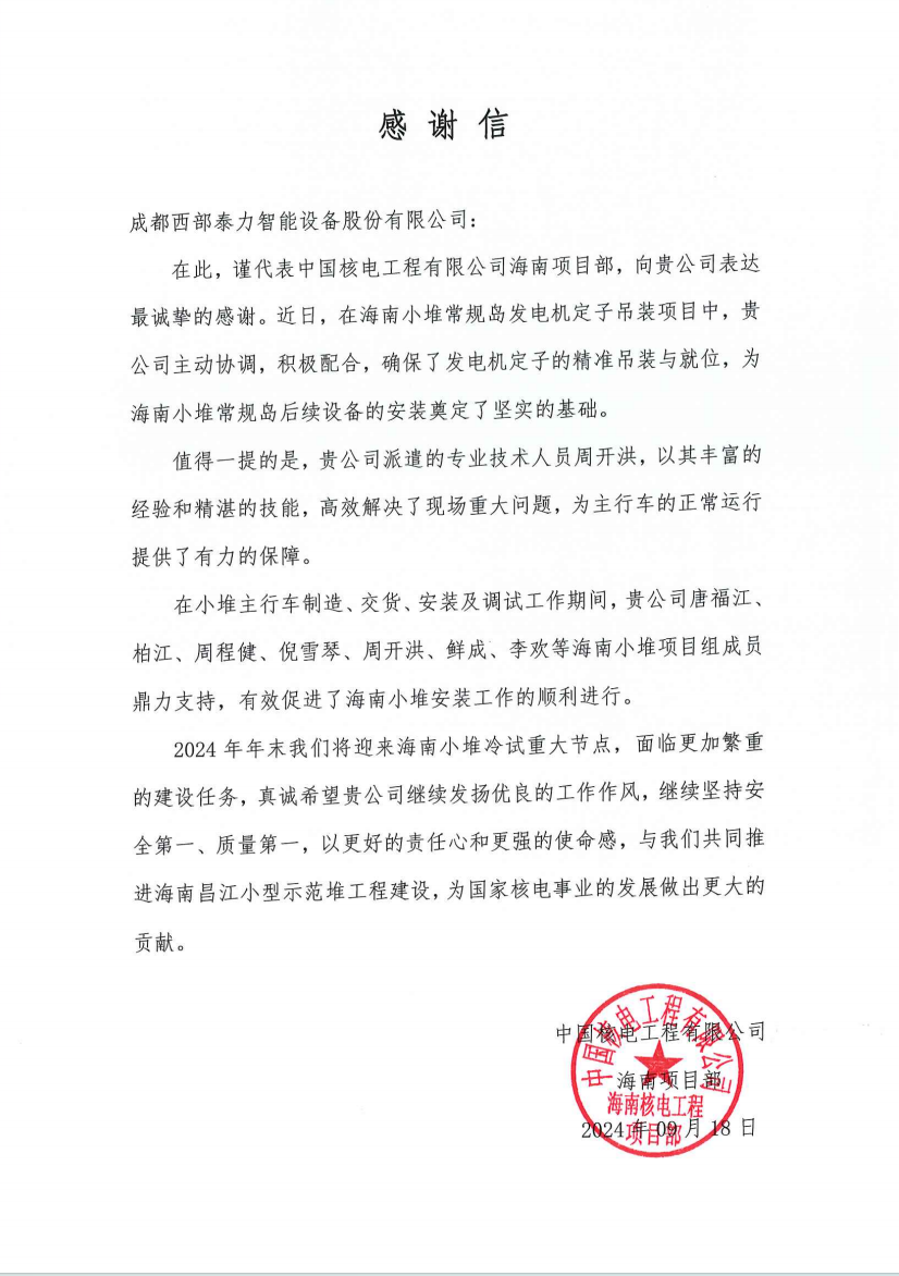 “玲珑一号”发电机定子吊装就位后,再次对西部泰力对主行车的制造、交付、安装及调试过程进行了感谢,信函中提到,公司派遣的驻场专业技术人员周开洪以丰富的经验和精湛的技能,高效解决了现场重大问题,为主行车的正常运行提供了有力的保障。倪雪琴、唐福江、周程建等在海南小堆项目执行过程提供了鼎力支持,有效促进了海南小堆安装工作的顺利。