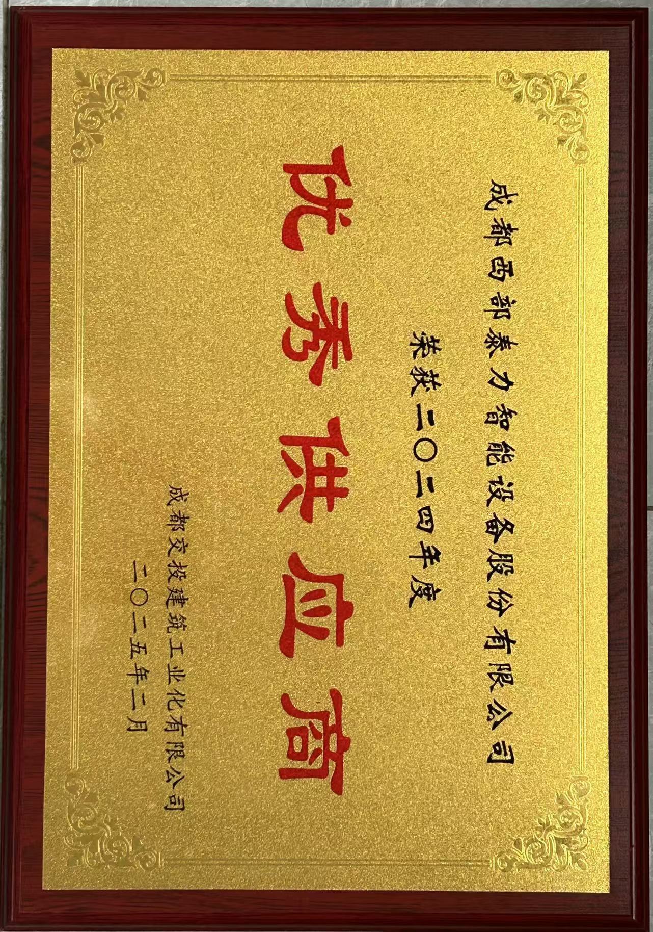 成都西部泰力智能设备股份有限公司凭借卓越的产品品质、高效的服务体系,荣获成都交投建筑工业化有限公司授予的“二〇二四年度优秀供应商”称号!这一荣誉不仅是行业对我们专业能力的高度认可,更彰显了我们在智能设备领域深耕细作、精益求精的态度。