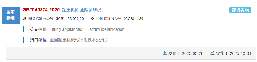 概要:西部泰力参与制定的国家标准《起重机械危险源辨识》(GB/T45374-2025)2025年3月28日发布,将于2025年10月1日起正式实施。